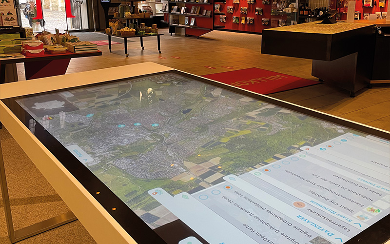 Der innovative Multi-Touchtisch von HI Zukunft hat einen neuen Standort: Ab sofort steht das interaktive Gerät in der Tourist-Information Hildesheim, Rathausstraße 20, und bietet Besucherinnen und Besuchern die Möglichkeit, die Smart-City-Projekte der Stadt auf anschauliche und intuitive Weise zu entdecken. Der Multi-Touchtisch ist ein modernes, interaktives Informationssystem mit großem, berührungsempfindlichem Bildschirm. Nutzende können sich hier spielerisch über die vielfältigen Aktivitäten und Projekte der Smart City Hildesheim informieren – von digitalen Stadtentwicklungsmaßnahmen über Routen und Touren bis hin zu zukünftigen Technologien, die das Leben in Hildesheim smarter und lebenswerter machen. Darüber hinaus gibt es wertvolle Informationen zum Beispiel zu Hochwassergebieten, Lärmpegeln oder Hitzeinseln im Stadtgebiet.