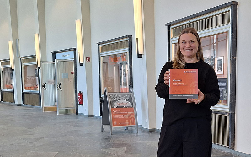 Für die Leiterin des städtischen Archivs Sonja Beinlich ist die neue Katalogreihe ein besonderes Projekt. „Damit erhalten wir für die Zukunft das historische Wissen aus Bad Salzuflen und bündeln es in einer lesens- und sehenswerten Publikation, sodass sich auch die nachfolgenden Generationen einen geschichtlichen Einblick über die Vergangenheit der Kurstadt erhalten.“ Die Publikation zu der Sonderausstellung „Wertvoll. Salzufler Geschichten zum Kriegsende vor 80 Jahren“ ist zum Preis von fünf Euro an drei Verkaufsstellen erhältlich: im Stadtarchiv („Gelbe Schule“, Martin-Luther-Straße 2), in der Tourist-Information (Kurgastzentrum, Parkstraße 20) und in der Buchhandlung Maschke (Osterstraße 48). Bereits in Vorbereitung ist die zweite Publikation zu der aktuell noch in der Wandelhalle laufenden Sonderausstellung „Applaus! 125 Kurhaus Bad Salzuflen, verkündet Beinlich abschließend.