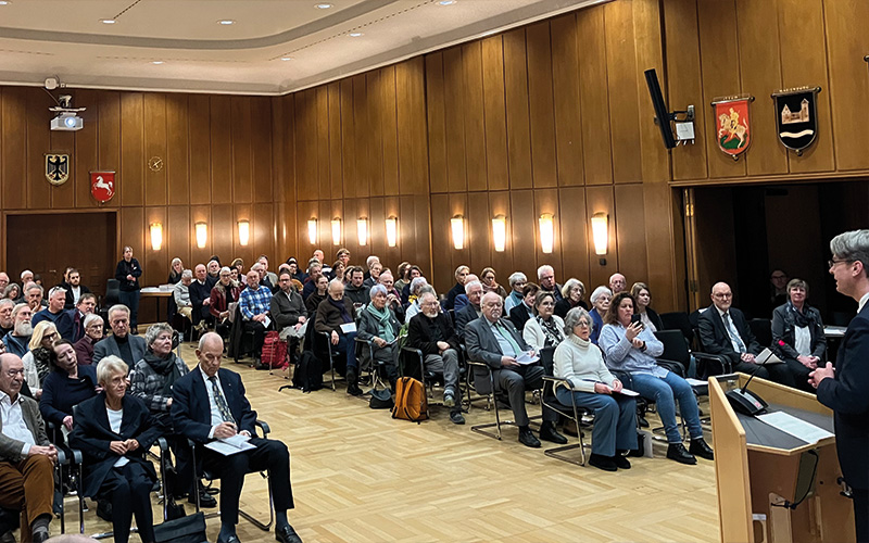 Am Mittwoch, 4. Februar, wurde im Rathaus das „Gedenkbuch für die als Juden verfolgten Hildesheimerinnen und Hildesheimer“ unter großer Anteilnahme Bevölkerung der Öffentlichkeit vorgestellt. Oberbürgermeister Dr. Ingo Meyer eröffnete die Veranstaltung im vollbesetzten Ratssaal – darunter unter anderem auch Michael Fürst (Präsident des Landesverbandes der Jüdischen Gemeinden in Niedersachsen) und Hildesheims Ehrenbürgerin Dr. Lore Auerbach – und betonte die Bedeutung des Werkes hinsichtlich der Erinnerung der Opfer antisemitischer Gewalt: „Es ist ein unschätzbarer Beitrag zur Bewahrung ihrer Namen und Biografien – gegen das Vergessen, gegen das Schweigen, gegen das Auslöschen von Identität und Würde. Die ausführlichen Lebenswege – mit Blick auf familiäres Umfeld, Berufsleben, Wohnorte und das Schicksal in der NS-Zeit – machen das Gedenkbuch zu einem bewegenden und notwendigen Zeugnis unserer Geschichte. Es durchbricht das Schweigen, das so oft über Unrecht liegt und gibt den Opfern ihre Geschichten zurück.“