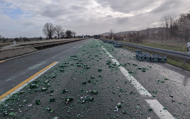 Als der 59-Jährige diese passierte, verrutschte die auf dem Sattelauflieger ungesicherte Ladung, durchbrach die Plane und verteilte sich auf allen Fahrstreifen der BAB 39. Bei der Ladung handelte es sich ausschließlich um Getränkekisten, in welchem sich Leergut in Form von Glasfalschen befunden haben.